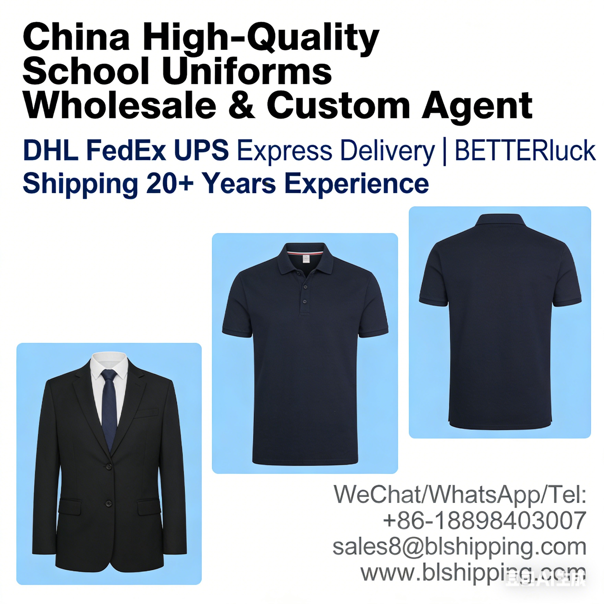 With 20 years of professional experience as a cargo broker and freight forwarder, BETTERluck Shipping (Guangzhou) Limited stands out as a reliable logistics partner for global clients engaged in high-quality school uniforms wholesale and customization business from China. We specialize in integrating one-stop logistics solutions, including premium international express services (DHL, FedEx, UPS), air transportation, sea shipping (LCL & FCL), professional customs clearance declaration, and door-to-door logistics (from seller to buyer). Adhering to the core concept of "cheap price, fast delivery, best service", we are committed to helping clients reduce logistics costs, improve delivery efficiency, and ensure the safe transportation of high-quality school uniforms (wholesale & custom-made) and various cargo worldwide. As a professional China agent for high-quality school uniforms wholesale and customization logistics, we have in-depth insights into the industry needs, product characteristics, and global shipping regulations (especially for textile products), making us your optimal choice for global cargo transportation from China.