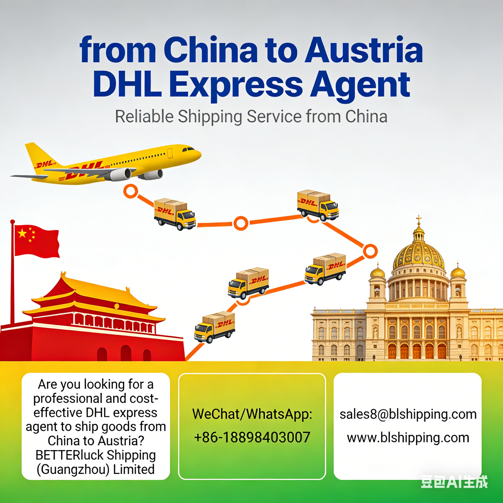 Are you looking for a professional and cost-effective DHL express agent to ship goods from China to Austria? BETTERluck Shipping (Guangzhou) Limited, established in 2007, is your trusted partner. With years of experience in international logistics, we specialize in China to Austria DHL express services, providing you with the best services at the cheapest prices. Whether you are a China factory, wholesaler, or e-commerce seller, our tailored shipping solutions will ensure your cargo reaches Austria safely, quickly, and smoothly.